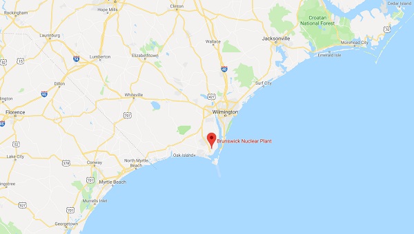 As the map shows, below, the Brunswick power plant is located just South of Wilmington, North Carolina. This is precisely where the eye of the hurricane made landfall: